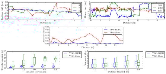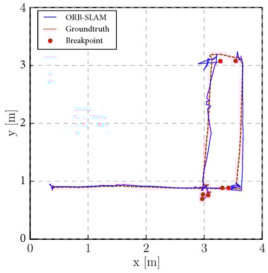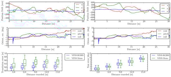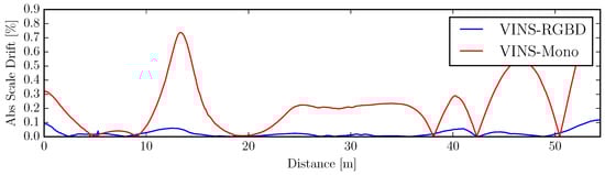 Compared to LIDAR Simultaneous Localization and Mapping (SLAM), which has under development for decades, visual SLAM (vSLAM) has recently gained more and more attention, especially after the influential work of Davison et al. [], which showed that SLAM with a single camera can run in real-time on a PC. Extended Kalman Filter (EKF) or its variants are often used in LIDAR SLAM, and also in that first MonoSLAM []. Optimization based methods are becoming more popular, since they can find the sparsity of the Hessian matrix in the optimization function and can usually provide more accurate results. PTAM [] was the first optimization based method and also the first one to propose to do tracking and mapping in parallel. Based on that tracking front end and optimization back end, approaches such as ORB-SLAM [] were developed, which additionally use bag-of-words [] to do loop detection to reduce the accumulative error. After projecting the environment to image planes, the depth information is lost and only the perspective geometry relationship is saved. Therefore, monocular SLAM is up-to-scale. However, combined with another camera with a fixed, known baseline, we can obtain the depth by calculating the disparity of sufficiently distinguishable feature points. Next to this stereo camera approach also structured light and Time of Flight (ToF) techniques, combined with a color camera, can also provide depth and color data, thus RGBD data. Visual SLAM with RGBD cameras [,] can be applied to robot autonomy and navigation. As both stereo and RGBD SLAM are using a single camera as the perception source, the performance is limited by camera characteristics such as motion blur under fast rotation, distortion caused by the rolling shutter, and also the short measurement range of the RGBD camera.