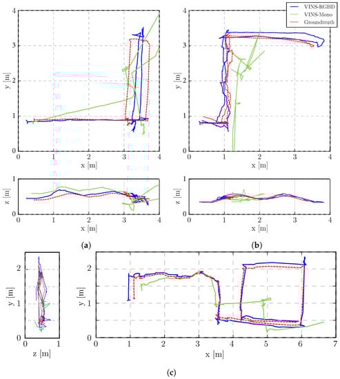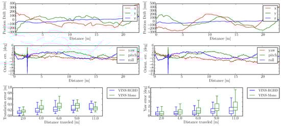 Unlike Unmanned Ground Vehicles (UGVs), Unmanned Aerial Vehicles (UAVs), especially quad-copters, have to estimate their motion in 3D with 6 degrees of freedom. To avoid obstacles also the unknown scale factor has to be solved. So there is considerable work on vSLAM for UAVs where the cameras are combined with inertial measurement units (IMU) to achieve robust and scale deterministic pose estimation. Due to the complex motions of the UAV, the IMU is sufficiently activated and thus unobservable states are avoided. The visual and inertial fusion also called VINS (Visual INertial System). It is usually divided into the categories of loosely and tightly coupled systems, where the former [,] treats the two sensors as individual pose estimation sources and fuses them by using EKF. Tight coupled visual inertial fusion has both EKF based algorithms such as ROVIO [], MSCKF [] and optimization based algorithms such as VINS-Mono [] and OKVIS []. Tightly coupled methods joint all the IMU and camera states together and usually get more accurate results. Most of the VINS are developed to deploy on UAVs or handheld applications. They only fuse a single camera with IMU, as this already gives good results in their application. However, in optimization based algorithms, it is easy to add other residual terms, hence, making it possible to fuse IMU with stereo or even more other sensors []. This can also solve the problem mentioned in [], which is that the scale is unobservable under special motions. However, they only give the results of 2D performance, and also requite a complex configuration of the stereo camera with the IMU sensor, especially w.r.t time synchronization. Besides the unobservability problem, initial values of VINS are crucial for the subsequent VIO (Visual Inertial Odometry) process, and lots of work [,,] has been put into achieving better performance, mostly for handheld or UAV applications.