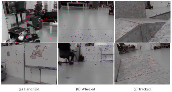 VINS-Mono supports both rolling and global shutter cameras. It is using the KLT sparse optical flow algorithm [] to track Shi–Tomasi features []. The features are made to be uniformly distributed over the images to achieve a robust tracking performance. Keyframes are selected by checking the average parallax between the current frame and the latest keyframes, along with the number of tracked features. If the parallax is beyond a certain threshold or the number of tracked features is below a certain threshold, a new keyframe is inserted.