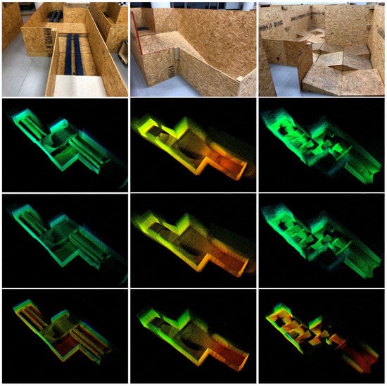 Mapping result corresponding to comparison in Table 2, from left to right: lab (large), arena (middle), arena (small).