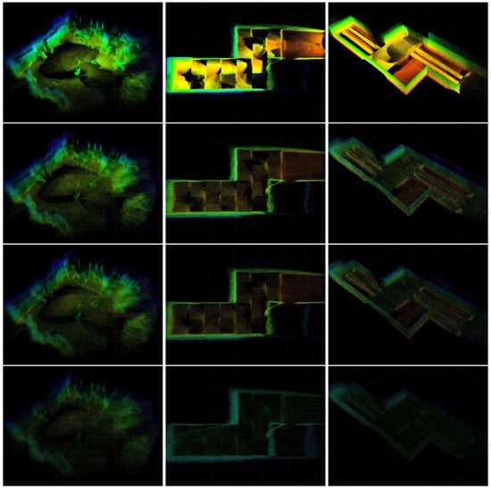 Figure 20 shows the results of our VINS-RGBD mapping. In every column, there is one of the test methods. The rows with the maps show the mapping with all subsampled points on the top, the maps with the upper limit of five points in an octree cell in the middle and the maps where additionally points in cells with fewer than three points are filtered in the bottom. Note that the last filter step is triggered manually here to keep it consistent with the above maps. Comparing the third rows to the second rows, we can see that the map structure remains very similar while the point density is reduced. The last rows eliminate points if fewer than a threshold of 3 are in a cell. We can see that the point clouds is further reduced, mainly in areas which are of little interest. To quantitatively evaluate the efficiency of the octree structure based strategy, we perform experiments in three different size scenes: lab (large), arena (middle), and arena (small) in Table 2. The corresponding map results are shown in Figure 21. The experiments evaluate the upper bound number during the VIO process, filtering after loop closing is disabled to keep the results consistent. We can see with the upper bound number decreasing, the number of points is also reduced near linearly. The last two columns list the update time after loop closure with an octree leaf capacity at 5 and the speed up rate compared to origin points. This is calculated by points rate, since the points update time is linearly related to the number of points.