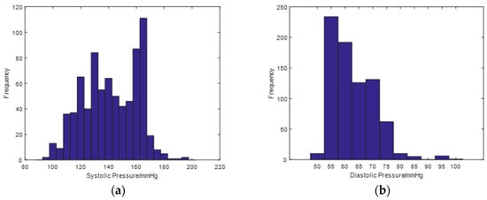 The data in this study were retrieved from the MIMIC-III Waveform Database, a multiparameter critical care database open to the public at the Massachusetts Institute of Technology (MA, USA) []. The MIMIC-III Waveform Database Matched Subset contained 22,317 waveform records and 22,247 numeric records from patients; some of the waveform records provided biosignals, including ECG, PPG, and ABP signals, captured simultaneously by monitoring beds in the intensive care unit. The database not only ensured data diversity but also offered ABP signals as a standard comparison, providing a solid data foundation for the construction of BP estimation models. In this study, a total of 772 sets of waveform data were acquired online using the WFDB Toolbox in which the function RDSAMP allowed users to load PhysioNet waveform data into MATLAB’s workspace []. All experiments in this study were based on the MATLAB platform. The distribution of BP in the experimental dataset is shown in Figure 1. The plots demonstrated that the data were widely distributed, covering from low BP to high BP values, and could be used to effectively evaluate the predictive power of the models.