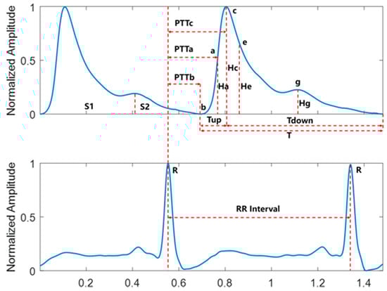 To construct a dataset for the BP estimation models, it was necessary to accurately extract the features of the original signals and select effective features, improving the generalization and reducing overfitting. In this study, 14 BP-related features, including PTT, heart rate (HR), and characteristics of pulse waveform, were selected, as shown in Figure 2. The detailed relationships and definitions are as follows: