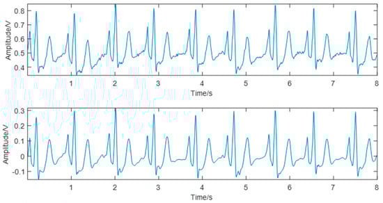 The ECG signals collected contained two major types of noise: myoelectric interference and baseline drift. In this study, the Symlet 8 (sym8) wavelet was used to decompose the ECG waveform into eight scales. The approximate component of scale 8 was directly zeroed to remove the baseline drift partially, and the detail component of scale 1 was directly zeroed to remove part of the myoelectric interference. The other components were processed by combining the “sqtwolog” fixed threshold and the soft threshold function to effectively eliminate the noise and retain the main components of the waveform. The denoising results are shown in Figure 4.