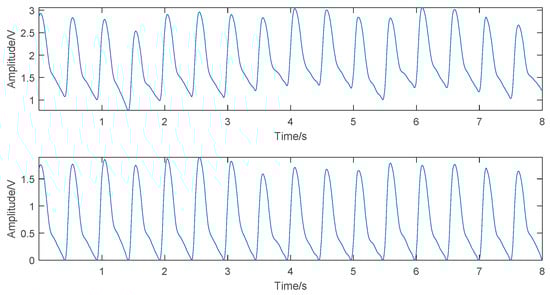 For a major baseline drift in PPG, according to the pulse valley positions in the original signal, this study first used the cubic spline interpolation method to fit the drifting baseline and then subtracted the fitted curve from the original signal to get the baseline drift-removed PPG. The PPG denoising results are shown in Figure 5.
