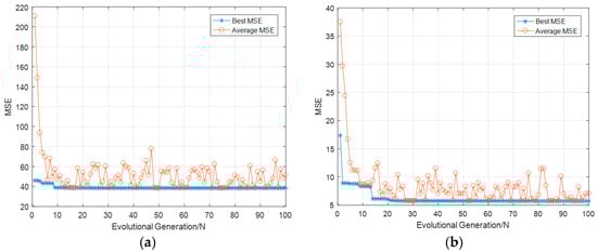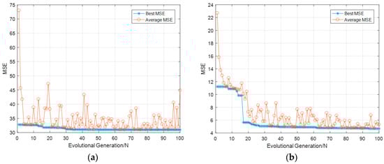 Genetic algorithm (GA) optimization process for initial models, the mean squared error (MSE) served as the fitness value of individuals in each generation. (a) Systolic blood pressure (SBP) model. (b) Diastolic blood pressure (DBP) model.