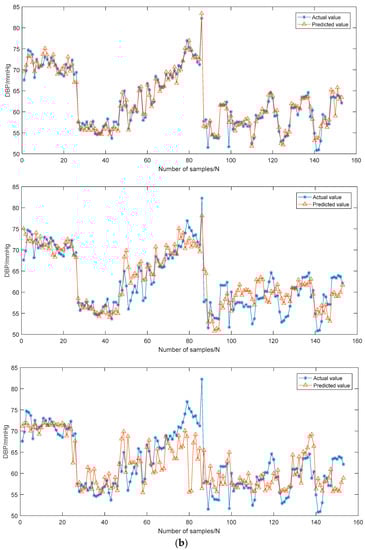 Comparison of predicted values and actual values. (a) SBP models. (b) DBP models. For both (a) and (b), from top to bottom, using GA-MIV-SVR, traditional multivariate linear regression (MLR), and pulse transit time to point c (PTTc)-SVR models.