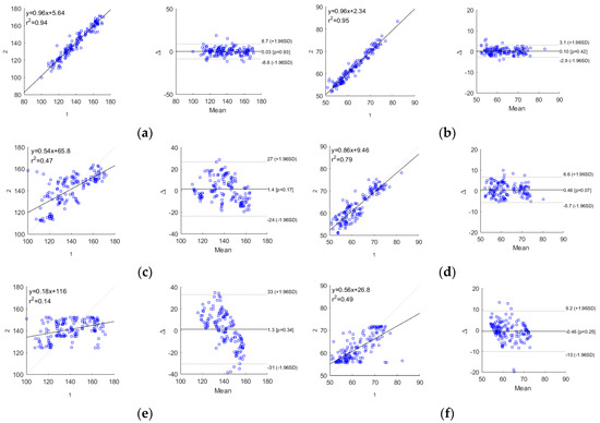 Correlation and Bland–Altman analysis. (a) GA-MIV-SVR SBP model. (b) GA-MIV-SVR DBP model. (c) Traditional MLR SBP model. (d) Traditional MLR DBP model. (e) PTTc-SVR SBP model. (f) PTTc-SVR DBP model.