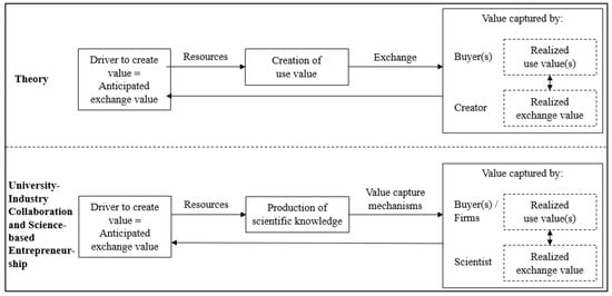 The exchange of scientific knowledge happens through different knowledge dissemination activities. Typically, scientific knowledge dissemination happens through scientific publications, conference presentations, book presentations, interviews, and so forth. Thereby, the selection of a dissemination activity is influenced by field-specific norms. Commercial value capture mechanisms are also applied by scientists, across all fields, that allow them to commercialize their knowledge such as patenting, licensing, consulting, or academic entrepreneurship [,]. In the context of university-industry collaboration and science-based entrepreneurship, this means that the right to use the knowledge is given (e.g., through licensing, consulting, and patenting) in exchange for money. Thereby, whatever utility the buyer perceives is the uniquely realized use value. This use value can differ for any actor who uses the scientific knowledge. The monetary value received by the scientists can be considered as a further realized exchange value. Hence, in the case of a publication, every reader realizes an individual use value, as well as the publisher who normally owns the rights. In this case, the realized exchange value is the royalty fee the scientists get from the publisher, based on the sales of the publication, if any2. In the case of a licensing-deal, the firm that licenses the scientific knowledge can create new innovations (use value in terms of future realized exchange value), while the scientists receive the licensing fees paid by the firm (exchange value). However, whether a scientist is willing to engage in the value creation process (i.e., knowledge production and dissemination) in the first place, depends on the anticipated exchange value [] (i.e., the anticipated value to be captured by the scientist and not only on the pure ability to engage).