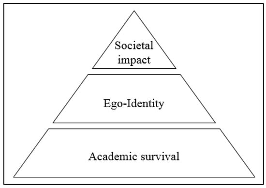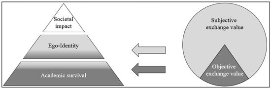 First, scientists use dissemination mechanisms to capture value from the scientific knowledge they have produced. By disseminating their scientific knowledge, scientists empower academic and non-academic actors (e.g., the general public, firms, and policy makers) to capture use value from their knowledge if users pick it up. Second, the realized exchange value consists not only of a monetary dimension as conceptualized in previous studies, [] but also of a subjective dimension that includes social recognition, reputation, and the validation of the ego-identity status. This finding is in line with prior research indicating that softer factors such as access to knowledge, reputation, or other non-monetary rewards might represent resources and, thus, value, on its own []. Third, the realized subjective exchange value is considered as valuable due to scientists’ needs. Figure 6 illustrates this relationship. While the objective exchange value (direct or indirect monetary rewards) serves primarily to satisfy scientists’ needs for academic survival, it also satisfies ego-identity needs. Receiving a meaningful grant can, for example, provide scientists with the desired funding to increase the chance of academic survival, while, at the same time, it pushes scientists’ self-efficacy needs. Furthermore, while the realized exchange value can be clearly differentiated into objective and subjective rewards, the rewards’ effect on satisfying needs is subjective (indicated by the blurred line in the needs’ pyramid in Figure 6). Based on our data, we argue that some scientists ascribe a different utility to different types of rewards (e.g., while some scientists might ascribe a high utility to social recognition or salary increase, others might not). This perception might also be driven by disciplinary differences in what is considered in the evaluation scheme for scientists.