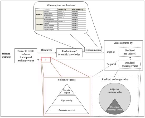 Although knowledge dissemination is a main and crucial part of a scientist’s job, insights into strategies for systematically capturing value from scientific knowledge are, so far, mainly described in the context of university-industry collaborations and in connection with science-based entrepreneurship [,,]. Such value capture mechanisms primarily consist of formal transfer mechanisms such as patenting, licensing, or consultancy that generate royalty fees in the short-term or long-term (i.e., monetary rewards). However, most dissemination of scientific knowledge happens through paper or book publications, conferences, or education. Since much of the current literature considers value captured in exchange for scientific knowledge to be monetary only [,,,], these mechanisms would paradoxically only indirectly lead to value captured for the knowledge creating scientists1. This becomes even more apparent when considering “on top” dissemination activities that currently either do not contribute to a scientist’s performance assessment, or that contribute to a lesser extent in current evaluation systems (e.g., continuous education, social engagement, and knowledge transfer including open knowledge/data transfer practices). Often, such scientific dissemination activities aim to foster linkages to the general public as encouraged by universities’ Third Mission efforts (e.g., public engagement, science nights, continuing education, social engagement, and dialogue) []. Following this current understanding, scientists engaging in such Third Mission activities are either irrational economic actors, or the application of a value capture perspective in the scientific context bears inefficiencies in explaining what value scientists receive in exchange for their knowledge dissemination activities. Subsequently, the question is why scientists apply dissemination mechanisms that go beyond their performance evaluation scheme (e.g., publications versus social engagement). Therefore, in this paper, we want to explore the following research question: How do individual scientists capture value from their scientific knowledge production and dissemination activities?