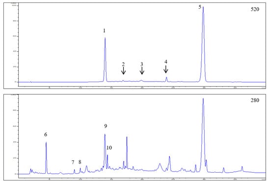 HPLC-DAD chromatograms of elderberry (Sambucus nigra L.) fruit extract recorded at 520, 280, 325, and 355 nm, respectively. Peak numbers and retention times refer to compounds indicated in Table 2.