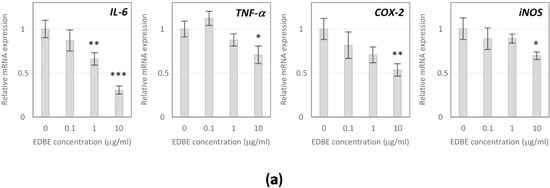 Anti-inflammatory effects of EDB extract were evaluated in activated RAW 264.7 macrophages, considering proinflammatory cytokines and mediators determined at both molecular and cellular levels, using low non-cytotoxic extract doses of 0.1, 1, and 10 µg/mL. The obtained results demonstrated the ability of EDB extract to alleviate the cellular inflammatory response induced by LPS. The extract at concentrations of 1 and 10 µg/mL suppressed mRNA expression of IL-6 by 34% (p < 0.01) and 69% (p < 0.001), respectively, compared to control macrophages. Moreover, a 28% decrease in TNF-α mRNA level (p < 0.05) was observed following treatment with EDB extract at a dose of 10 µg/mL (Figure 5a). The down-regulation of IL-6 and TNF-α expression was consistent with the inhibited secretion of these cytokines. Namely, EDB extract assayed at 1 µg/mL reduced production of IL-6 and TNF-α by 44% and 26%, respectively (p < 0.05). At the extract concentration of 10 µg/mL, the 60% decrease in IL-6 secretion (p < 0.01) was observed while synthesis of TNF-α was reduced by 52% (p < 0.001) (Figure 5b).