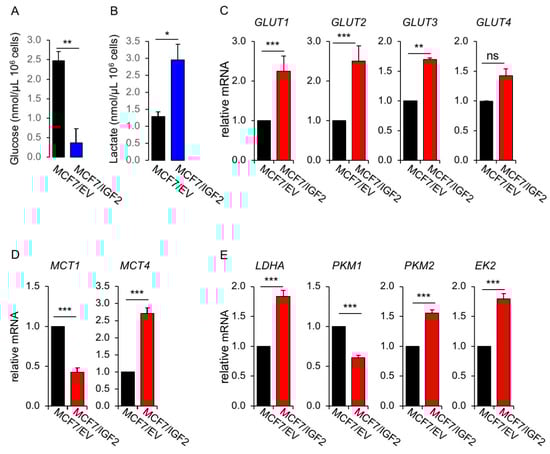 1. Glycolytic activity. To assess whether constitutive IGF2 expression affects the metabolic phenotype of BC cells, we first evaluated glucose consumption, lactate production and the expression of transporters for glucose and lactate as well as key glycolytic enzymes in both MCF7/IGF2 and control MCF7/EV cells. MCF7/IGF2 cells, incubated for 48 h in serum free medium, showed reduced extracellular glucose levels (0.37 ± 0.37 nmol/µL vs. 2.47 ± 0.24 nmol/µL of glucose concentration per 106 cells in MCF7/IGF2 and in MCF7/EV cells, respectively; p = 0.009) suggesting increased glucose uptake/consumption (Figure 2A). At the same time, MCF7/IGF2 cells showed increased lactate secretion in the conditioned medium (2.95 ± 0.47 nmol/µL vs. 1.29 ± 0.15 nmol/µL of lactate concentration per 106 cells in MCF7/IGF2 and MCF7/EV cells, respectively; p = 0.028) (Figure 2B), suggesting increased lactate production.