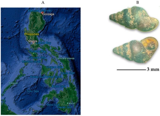 (A) Map showing Gonzaga, Cagayan Valley in the Philippines []; (B) O. hupensis quadrasi, the snail intermediate host of S. japonicum in the Philippines, collected from Gonzaga, Cagayan Valley. The upper panel shows the aboral side and the lower panel shows the oral side where the snail’s operculum could be seen.