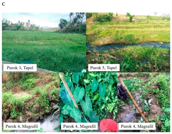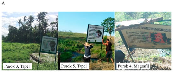 (A) Signages of schistosomiasis-endemic sites in Gonzaga, Cagayan Valley; (B) Actual snail sites mapped using qGIS 3.6.0. visited in barangays Tapel and Magrafil for soil collection; (C) Sampling collection sites in Purok 3, Tapel, Purok 5, Tapel, and Purok 4, Magrafil.