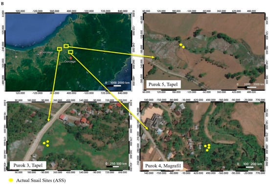 Overall, there were nine sampling areas (Figure 2B and Figure 6A): three in Purok 3, Tapel; two in Purok 5, Tapel; and four in Purok 4, Magrafil, with nine ASS sampling points and 18 PSS sampling points for a total of 27 (Figure 6A,B). In each sampling point, three replicates of soil samples were collected accounting to a total of 81 soil samples (Figure 6B). The GPS coordinates of all sampling points of ASS and PSS, whether positive or negative to O. hupensis quadrasi eDNA, were also recorded and mapped (Figure 4).