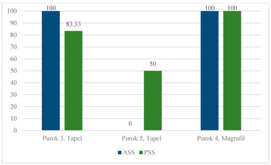 Specifics of eDNA detection rate is summarized in Figure 3. In Purok 3, Tapel, all ASS (100%) had detectable eDNA, whereas all 5 out of 6 PSS were positive for eDNA (83.33%). In Purok 5, Tapel, no eDNA was detected in 2 ASS visited, whereas 2 out of 4 PSS (50%) had detectable eDNA. Moreover, eDNA was detected in all sampling areas in Purok 4, Magrafil.