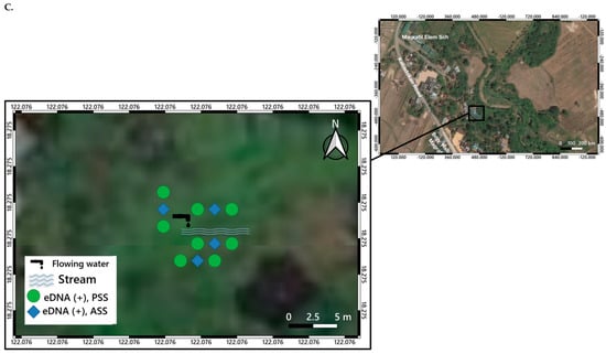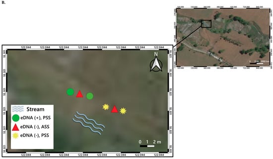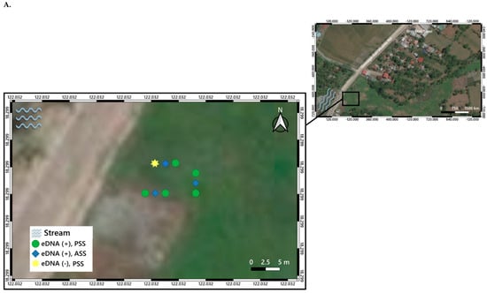 Specific location points of ASS and PSS classified according to the results of qPCR detection of O. hupensis quadrasi eDNA were determined using Global Positioning System (GPS) and plotted in the map using qGIS (Figure 4A–C). Water bodies such as streams as observed during the field visit were also incorporated in the map as indicated in the legend of each map generated.