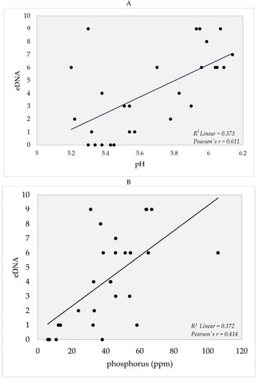 There was a moderate positive correlation (ρ = 0.611) in the pH with eDNA detection (Figure 5A). Although pH values increased as the number of eDNA positive readings in qPCR increased, increasing pH may not necessarily mean that O. hupensis quadrasi could tolerate a very basic environment since the snail generally thrives at a range of 4.6 to 9 []. The positive correlation in our results, however, may imply that O. hupensis quadrasi could tolerate slightly acidic environments (5.20 to 6.14) or the snail’s DNA is stable in these pH conditions. If the pH becomes very basic, the O. hupensis quadrasi productivity becomes low [], whereas a very acidic environment promotes DNA degradation and shell erosion, which may lead to death [].