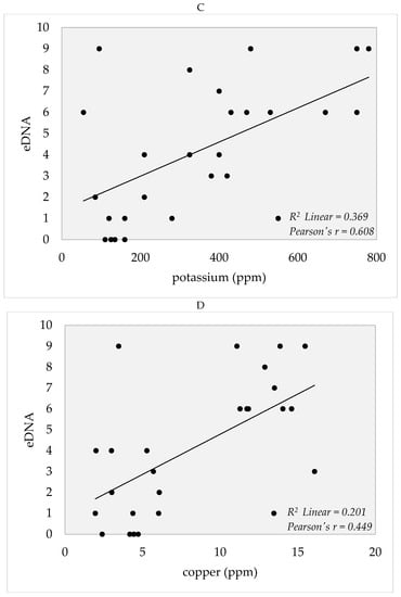 Copper (Cu) also showed a moderate positive correlation (ρ = 0.449) with number of detected eDNA (Figure 5D). The correlation may reveal a possible tolerance of the snail to increasing Cu (up to 16.08 ppm) since this element is toxic to snails with increasing amounts []. In other gastropod species such as Melanoides tuberculata and Theodoxus niloticus, the mean lethal concentrations to Cu are 0.14 ppm and 8.6 ppm, respectively [,]. A study by Moreno and McCord [] showed that high Cu has adverse effects on DNA processing by directly interacting with the DNA, thereby altering its chemical structure []. Moreover, Cu-based compounds such as copper sulfate (CuSO4), copper pentachlorophenate, and copper-controlled release glass (CRG) are used as molluscicides to intermediate hosts of Schistosoma spp. [,]. CuSO4 specifically is known to be toxic to snails in minute doses for as low as 2 ppm, which can cause death after 48 hours of exposure [].