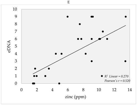Zinc (Zn) also showed a moderate positive correlation (ρ = 0.520) (Figure 5E). Since compounds of Zn such as ZnO nanoparticles serve as molluscicides to Oncomelania snails and Biomphalaria alexandrina [,], the positive correlation of zinc with eDNA detection may indicate a possible tolerance of O. hupensis quadrasi to rising zinc levels (up to 13.48 ppm; Supplementary Material Table S3). The mean lethal concentrations of 3.9 ppm and 12.2 ppm occur in M. tuberculata and T. niloticus. There is a high probability that zinc-based consumer products (e.g., batteries) leach out from Zn-contaminated sites to the endemic sites [].