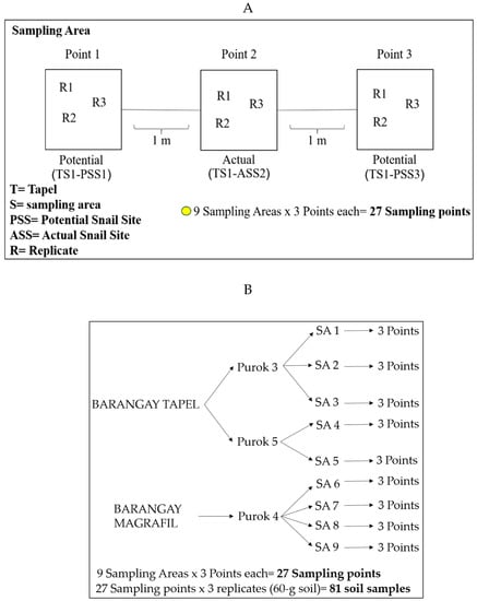 (A) Established ASS and PSS in one sampling area; (B) Overall sampling points and soil samples in barangay Tapel and Magrafil.