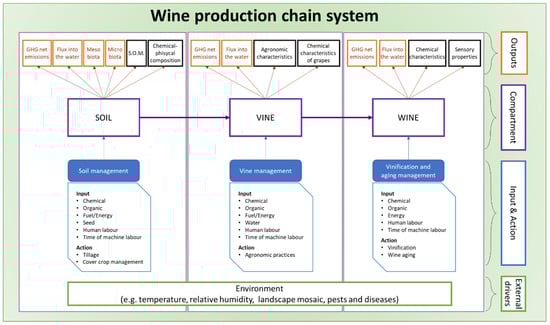 The DSS to which we refer in this paper (BIOPASS®, for further details see [,]), was developed to assess the sustainability of the wine production chain with a set of methodologies. The DSS defines a system in which three main compartments are described: soil, vines and wine, as shown in Figure 1. Specific input and output are identified for each compartment, as well as external drivers influencing the overall system. The input concerned management of the compartment and it was divided into two groups: (i) chemical, physical, mechanical and human related inputs; (ii) actions (e.g., agronomical practices). As regards the output, we considered (i) production outputs, such as agronomical characteristics, chemical characteristics of grapes and wine, sensory properties, and (ii) chemical-biological outputs, if considered to have an impact on the specific environmental context.