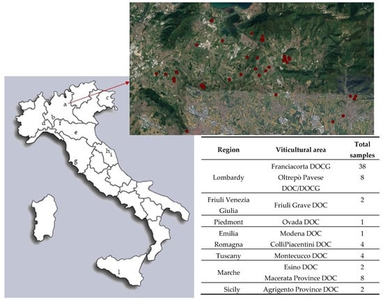 Map of locations of different wine growing areas where samples has been collected. For Franciacorta DOCG a deeper level of detail is shown in relation to the high number of vineyards investigated.