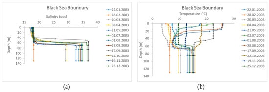 Stratification in the Istanbul Strait is not only related to flow rates, but also it is relevant to hydrographic data, which is also named as salinity and temperature at the same time. Due to the brackish water originating from the Black Sea, the upper layer of the Istanbul Strait is less saline than the lower layer. The salinity of the upper layer fluctuates between 15–25 ppt, whereas the lower layer’s salinity is nearly 35–40 ppt [,]. It should be noted that a less saline upper layer has a larger depth in the northern side of the Strait compared to the upper layer water mass in the southern side. This depth difference leads to a salinity gradient that directly affects the hydrography of the strait. Temperature variation is another important hydrographic feature of the strait. The upper layer has a high seasonal variability from the temperature aspect. For instance, in January, February, March, April, October, November, and December of 2003 year, the upper layer was colder than the lower layer []. On the other hand, in May, June, July, August, and September of the same year, the upper layer was warmer. In addition to this warmth, a cold intermediate layer comes into existence in these five months. The mentioned cold intermediate layer is residual from the cold winter months [].