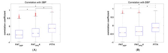 The mean and standard deviation of the Pearson correlation coefficients between the four BP values (i.e., SBP, DBP, MBP, and PP) and the nine time-based features (i.e., PATABP, four PATPPGs, and four PTTs) are shown in Table 2. Among the features, PATABP showed the highest mean correlation to BP with -0.46 for SBP, −0.35 for DBP, −0.42 for MBP, and −0.50 for PP. Among the four PATs derived between ECG and PPG, PATPPG4 showed the highest mean correlation to BP with −0.37 for SBP, −0.30 for DBP, −0.34 for MBP, and −0.39 for PP. In the case of PTT, PTT4 showed the highest mean correlation to BP, but showed very weak mean correlation with −0.12 for SBP, −0.11 for DBP, −0.12 for MBP, and −0.11 for PP. The box plots of the correlation coefficients between four BP values and three features (PATABP, PATPPG4, and PTT4) are shown in Figure 5.