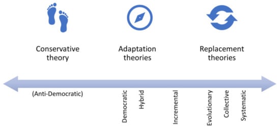 These three schools, with their internal variations, are illustrated in Figure 3 and explained below. The arrow in the figure serves to represent a continuum with the conservative and replacement theories on opposite extremes since the conservative approach advocates for little or no change while the replacement theories advocate for fundamental and significant change. The descriptions below are neither all-encompassing nor definitive but are presented to illustrate the continuum and to describe some of the dominant thinking behind land reform theories. Neither do the theories exist in isolation from one another on the continuum, but they may overlap in certain scenarios [] (see Table 2). The section begins with an overview of the arguments for and against replacement vs. conservation positions.