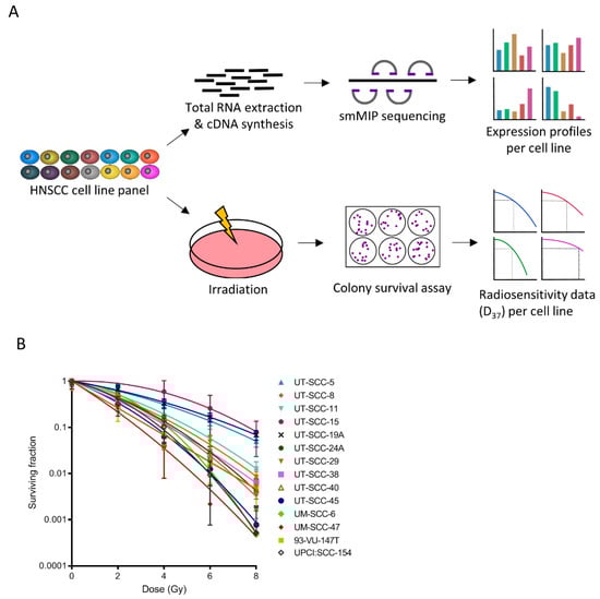 Characterization of 14 head and neck squamous cell carcinomas (HNSCC) cell lines. (A) Schematic representation of the approach to determine radioresistance or -sensitivity associated metabolic transcripts; (B) 10 HPV-ve (UT-SCC-5, 8, 11, 15, 19A, 24A, 29, 38, 40, and UM-SCC-6) and four HPV+ve (UT-SCC-45, UM-SCC-47, 93-VU-147T, and UPCI: SCC154) cell lines were exposed to 0, 2, 4, 6, or 8 Gy. Survival was determined by colony formation assay.