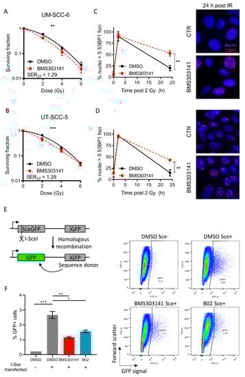 UT-SCC-5, UT-SCC-8, UT-SCC-9, UT-SCC-11, UT-SCC-15, UT-SCC-19A, UT-SCC-24A, UT-SCC-29, UT-SCC-38, UT-SCC-40, UT-SCC-45, FaDu (Kindly provided by Prof Grenman, University of Turku), UM-SCC-6, UM-SCC-47 (Kindly provided by Dr Carey, University of Pittsburgh), 93-VU-147T (Kindly provided by Dr Dorsman, Amsterdam University Medical Center), and UPCI:SCC-154 (DSMZ) were cultured in DMEM medium (Gibco) supplemented with 4.5 g/L glucose, GlutaMAX, 10% FBS, 100 u/mL penicillin/streptomycin, non-essential amino acids (Gibco), HEPES (Gibco), and sodium pyruvate (Gibco). U2OS DRGFP cells (provided by Prof Tim Humphrey, University of Oxford) were cultured in DMEM supplemented with 10% FCS and 5 mg/mL puromycin and 100 U/mL penicillin/streptomycin. Cells were treated with 5 µM BMS303141 (Sigma-Aldrich, St. Louis, MO, USA) in DMSO or 10 µM C75 (Merck) in DMSO for 6 h prior to irradiation. Single dose irradiation was delivered using a 320 kV XRAD irradiator (RPS Services Limited, Surrey, UK)) at a dose rate of 3.1 Gy/min. An overview of cell line characteristics and tissue origin can be found in Table S1.