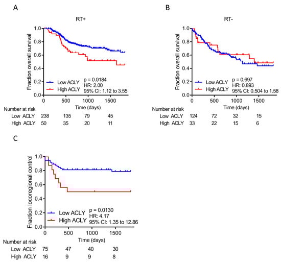 ACLY overexpression predicts poor response in RT treated HNSCC patients. (A,B) Kaplan–Meier analysis of HNSCC patients that have high or low ACLY expression based on the optimal cut-off point. Shown are plots for overall survival of HNSCC patients that received radiotherapy (A) and patients that did not (B). (C) Kaplan–Meier analysis of HNSCC patients that have high or low ACLY expression based on the previously determined cut-off point. Shown is locoregional control of HNSCC patients that received chemoradiation therapy.
