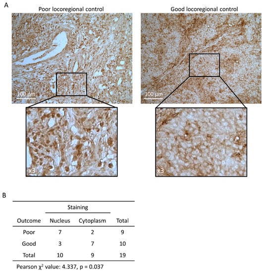 To further investigate the clinical impact of ACLY levels in more detail, we tested the levels of total ACLY protein in biopsies of HNSCC patients. 19 biopsies of HNSCC patients of a previously described cohort [] were selected for analysis, based on the locoregional control; nine patients with poor locoregional control (locoregional event within 177 ± 36 days), and ten patients with good locoregional control (all minimal recurrence free survival of three years) (Supplementary Table S4). We hypothesized that patients with a poor locoregional control had higher levels of ACLY than patients with a good locoregional control. Overall, ACLY expression seemed ubiquitously expressed in all patient samples, yet demonstrated a marked pattern in terms of cellular localization (Figure 4A). Strikingly, patients with poor locoregional control had significantly higher levels of ACLY in the nucleus (p = 0.037). In patients with good locoregional control, ACLY was almost unequivocally expressed in the cytoplasm, but not the nucleus (Figure 4B). This indicates that not only ACLY expression, but also its localization could play a critical role in determining treatment response in HNSCC patients.