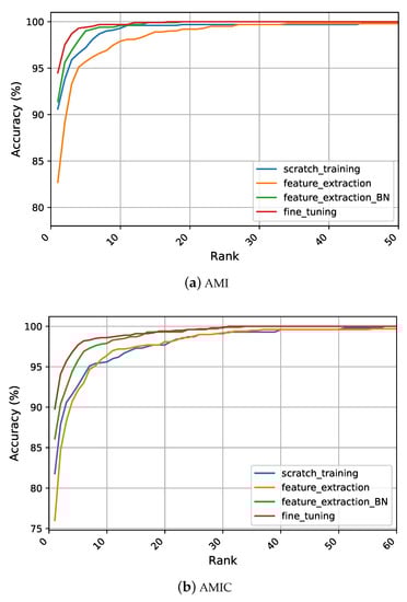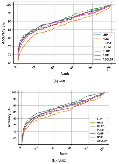 This section reports the experimental results for both handcrafted and CNN features. The obtained results are summarized in Table 3 using performance metrics of R1, R5, and AUC. The relevant work from the literature was also included for a direct comparison. To explore the comparability across the different methods, the CMC curves are presented for each recognition experiment in Figure 4 and Figure 5. We started our analysis by interpreting the recognition performance of the handcrafted features, then continued with the CNN features.