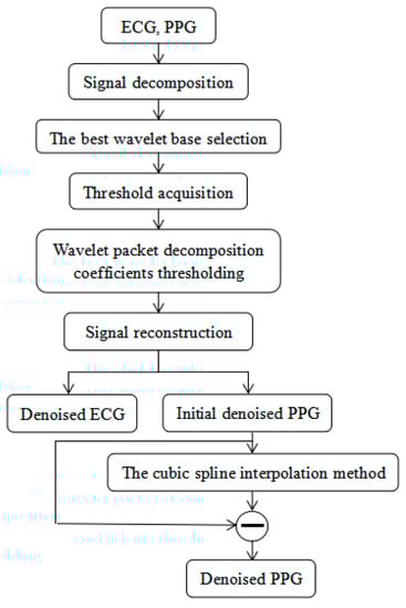 The ECG and PPG signals are weak physiological signals susceptible to industrial frequency, tremor, and breathing during signal collection. The denoising of ECG signals and PPG signals is indispensable to ensure accurate extraction of signal characteristics. In this study, the wavelet packet method was employed to denoise the ECG and PPG signals on the MATLAB 2016b platform (MathWorks, Natick, MA, USA) [], and the PPG signals were further denoised by the cubic spline interpolation method. The algorithm flow chart of the signal preprocessing is shown in Figure 1.