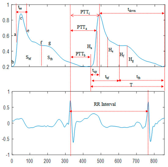 The time parameters were extracted from the denoised ECG and PPG signals, including the time from the pulse starting point b to the peak point c (tup) and to the f point of the dicrotic notch (tbf); the time from c and f to the point b of the next cardiac cycle (tdown and tfb, respectively); the time from the point a with maximum ascending slope to the point e with minimum descending slope of the photoplethysmography (tae); the ratio of the aforementioned time parameters to the cardiac cycle (tupr, tbfr, tdownr, tfbr, and taer); as well as the time from the R-wave of ECG to the photoplethysmography points b, a, and c within the same cycle (PTTb, PTTa, and PTTc, respectively). The amplitude parameters were the ratio of the amplitude of the points a, e, f, and g to the amplitude of the point c (Har, Her, Hfr, and Hgr, respectively). The area parameters were the systolic area Sbf and the diastolic area Sfb. Other types of parameters also existed, such as the K value (K = (Sm−Hc)/(Hc−Hb), Sm is the mean pulse wave area of the cycle), the heart rate (HR) calculated by the adjacent R-wave interval, and the main wave rising slope (Cslope). A total of 22 waveform characteristics were included, and a schematic diagram of some features is shown in Figure 2. In addition, two characteristics of the individuals were introduced: Gender and body mass index (BMI) (there was no significant difference in age between participants, so age was not considered in individual characteristics).