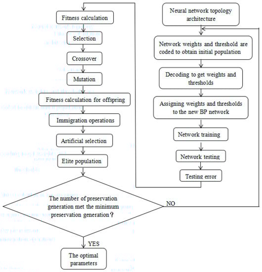 The algorithm flow chart of MPGA in optimizing BP neural network is shown in Figure 3. The detailed steps were as follows: