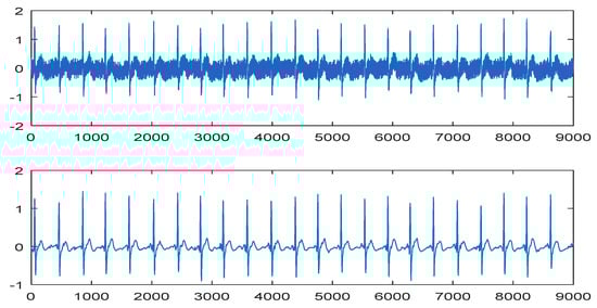 Comparison of the electrocardiography (ECG) signal before (top) and after (bottom) denoising.