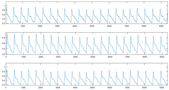 For the PPG signals, the initial denoising and processing were similar to the ECG signals. Nevertheless, for the baseline drift with great influence, this study treated it further using the cubic spline interpolation method []. The PPG denoising results are shown in Figure 6.