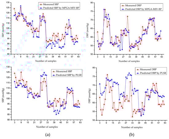 Comparison of predicted values and actual values. (a) SBP models. (b) DBP models. For both (a,b), from top to bottom, MPGA-MIV-BP, partial least squares regression (PLSR) models.