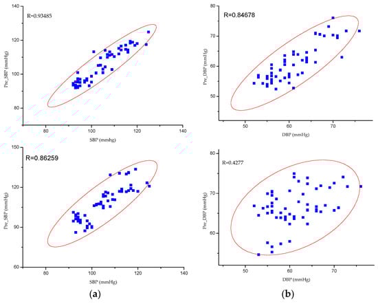 This study introduced the Pearson correlation coefficient (denoted as R) analysis [], as well as Bland–Altman analysis, to better study the correlations between the predicted and measured values for SBP and DBP. For the MPGA–MIV–BP blood-pressure models, the correlation coefficient of SBP and DBP was 0.93485 and 0.84678, respectively, both demonstrating strong correlations between the predicted values and the measured values. In addition, the Bland–Altman analysis of the predictive values and the measured values of SBP and DBP of the MPGA–MIV–BP blood-pressure models showed the mean difference was 0.3503 and −0.1873 (close to 0), indicating no significant differences between the predictions and the measurements. The correlation analysis and the Bland–Altman analysis of the predicted and the measured values of the MPGA–MIV–BP and PLSR blood-pressure models are shown in Figure 9 and Figure 10.
