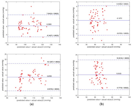 Bland-Altman analysis of predicted values and actual values. (a) SBP models. (b) DBP models. For both (a,b), from top to bottom, MPGA-MIV-BP, PLSR models.