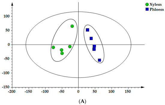 The orthogonal partial least squares discriminant analysis (OPLS–DA) scores scatter plot (A) and VIP (B) of xylem and phloem in SC.