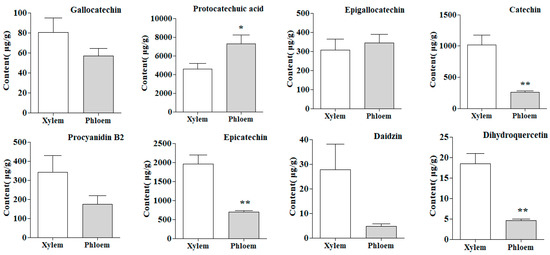 The average contents of 22 constituents in xylem and phloem of SC (* p < 0.05; ** p < 0.01).