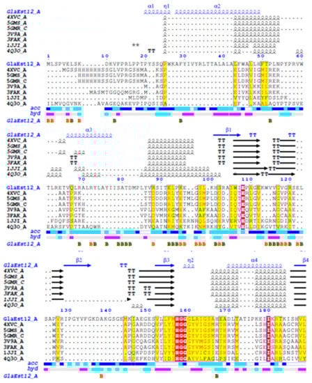 Multiple alignments of amino acid and secondary structure protein sequences from Glaciozyma Antarctica of hormone-sensitive lipase (GlaEst12) esterase with other related proteins. Squiggles indicate helices, arrows indicate β-strands, TT letters indicate a turn, ἠ letters indicate random coil and the catalytic triad are indicated by an arrow symbol. The identical and highly conserved residues are indicated by red and yellow colour, respectively.