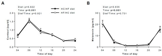 Interestingly, in our study, salivary secretion patterns of metabolic and inflammatory markers do not depend on timing of fat and carbohydrate intake. For adiponectin, IL-6 and MCP-1, this observation is in line with our previous report [12], where we showed that the HC/HF diet, in comparison to the HF/HC diet, did not change their average concentrations and/or diurnal variations. For melatonin and cortisol, it is generally thought that meal timing has only a limited influence on melatonin and cortisol [40], both of which are indicative of the central circadian clock in the suprachiasmatic nucleus, although a very recent trial suggests that early time restricted feeding may have been a direct impact on cortisol, leading to an increased amplitude [41]. Our study suggests that timing of carbohydrate and fat intake also has only limited influence on cortisol and melatonin, i.e., the oscillation patterns in saliva did not differ between our two diets. This is noteworthy as we could previously show that a shift from a carbohydrate-rich diet to a fat-rich diet leads to a delay in the salivary cortisol rhythms [33].