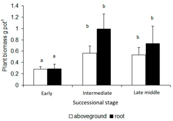 The soil used for the pot experiment was collected from a forest chronosequence in post-mining sites established by gradual heaping of overburden where spontaneous succession has taken place. The sites were located in the Sokolov mining district (50°14′04″ N, 12°41′04″ E, 450–520 m above sea level), the overburden was deposited mainly in the form of alkaline mudstones, which subsequently disintegrated in to smaller particles and amorphous clay. During soil formation, pH has gradually decreased, C and N have accumulated, and P has become more available []. The largest change in C and N accumulation happened between early and intermediate stages (Table 1). Early (16-years old), intermediate (22-years old), and late middle (45-years old) successional stages were used for soil sampling. Selected soil characteristics are presented in Table 1. The early successional stage was dominated by herbs and grasses (Tusilago farfara L. and Calamagrostis epigejos (L.) Roth) with scattered Salix caprea L. shrubs. The intermediate successional stage was overgrown by a dense cover of Salix caprea with occasional occurrence of Betula pendula Roth and Populus tremula L. and little or no understory. The late middle successional stage was covered by light broadleaf forest dominated by Betula pendula and Populus tremula. Dense grass and herb understory were observed at this stage. The grass A. elatius used for our experiment is a common plant in the described chronosequence and especially abundant in intermediate and late middle successional stages [].